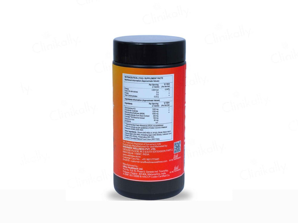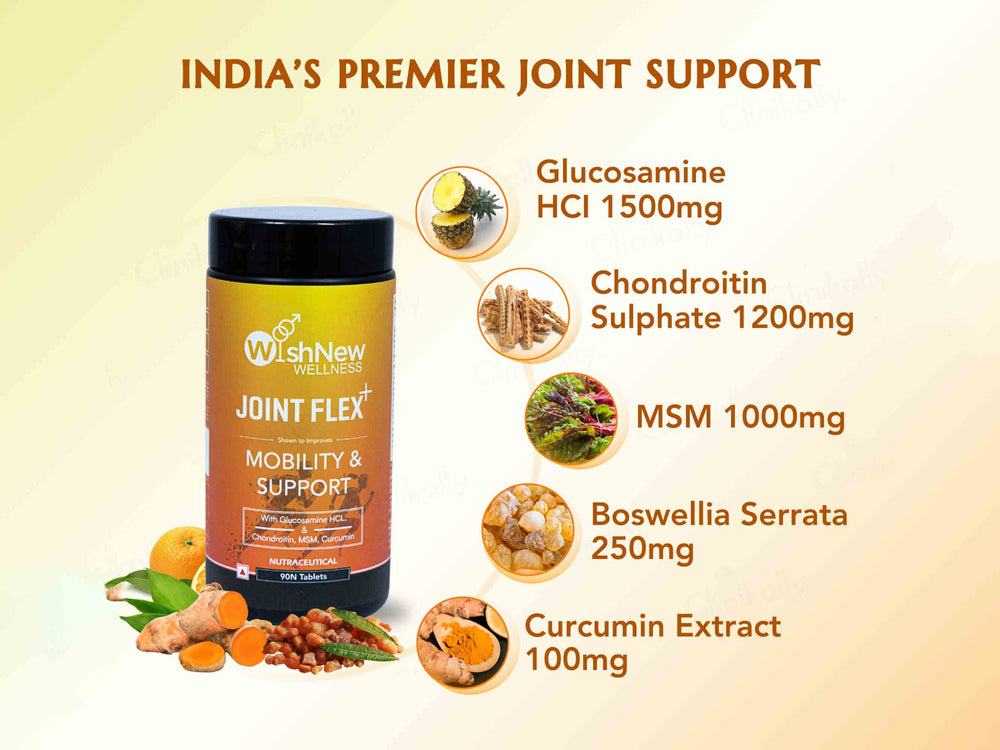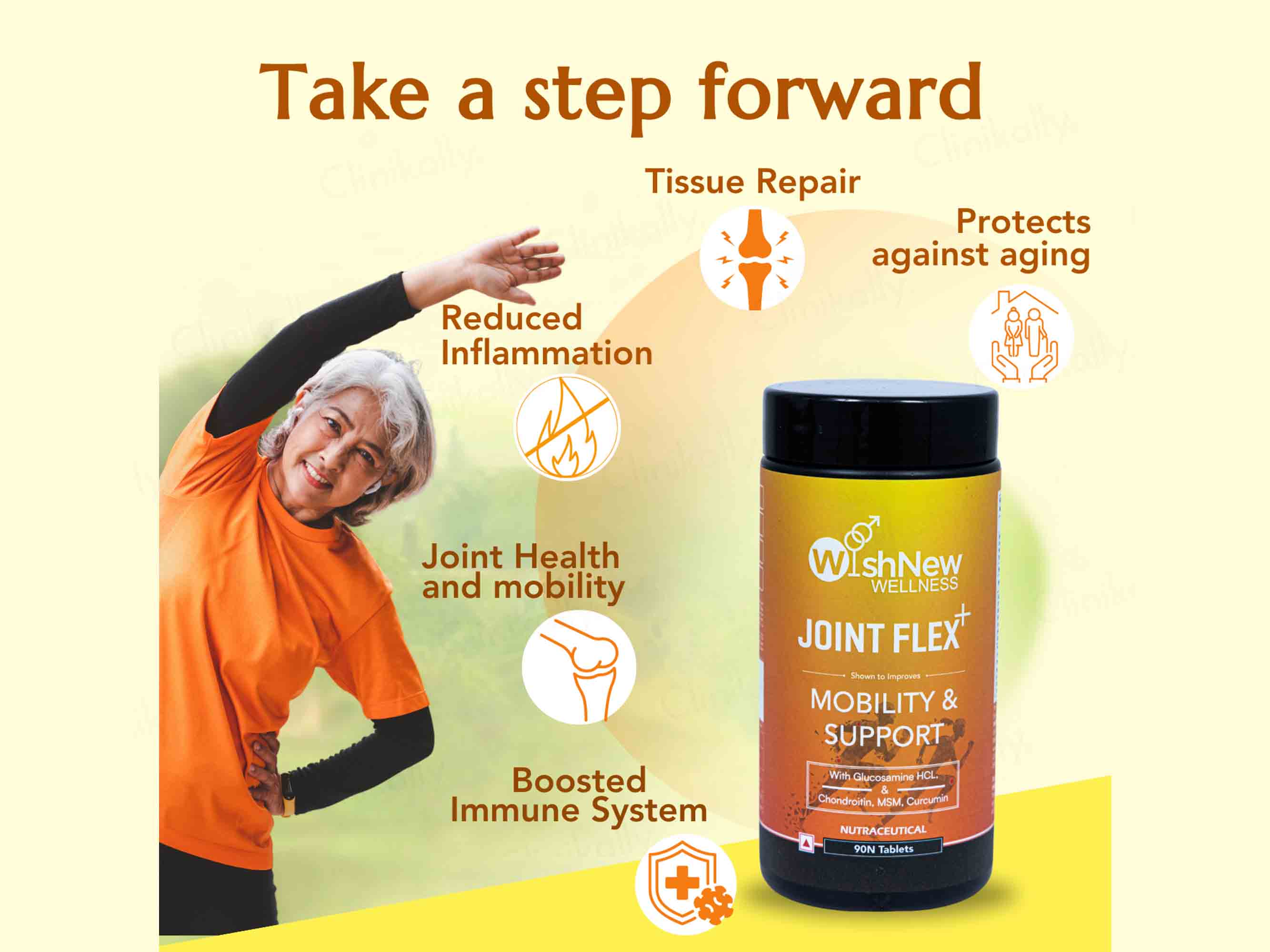 WishNew Wellness Joint Flex+ Mobility & Support Tablet is formulated with a blend of ingredients like glucosamine, chondroitin, MSM, and turmeric, known for their joint health benefits. These components work together to support cartilage health, enhance joint mobility, reduce inflammation, and alleviate joint discomfort, contributing to overall joint well-being and flexibility.