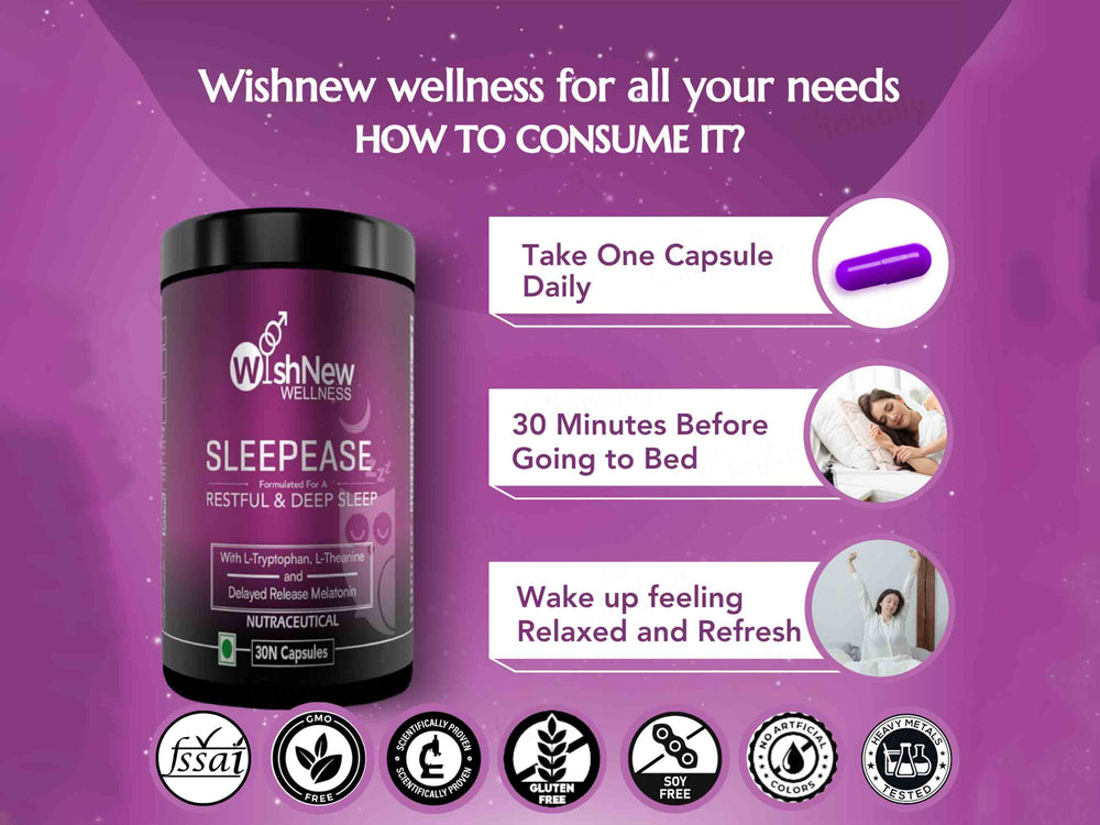WishNew Wellness Sleepease Restful & Deep Sleep Capsule is formulated with natural ingredients known to support relaxation and improve sleep quality. These ingredients work synergistically to help reduce stress and anxiety, promote relaxation of the mind and body, and regulate the sleep-wake cycle. By enhancing the overall sleep experience, it aids in achieving restful and deep sleep, allowing you to wake up feeling refreshed and rejuvenated.