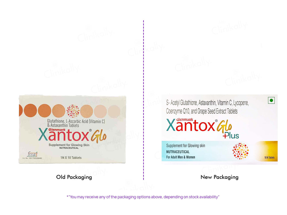 Xantox Glo Plus Tablet is a nutraceutical supplement containing L-Glutathione, Astaxanthin, and Vitamin C. It benefits the skin by delaying aging, stimulating collagen production, improving moisture, and controlling pigmentation.