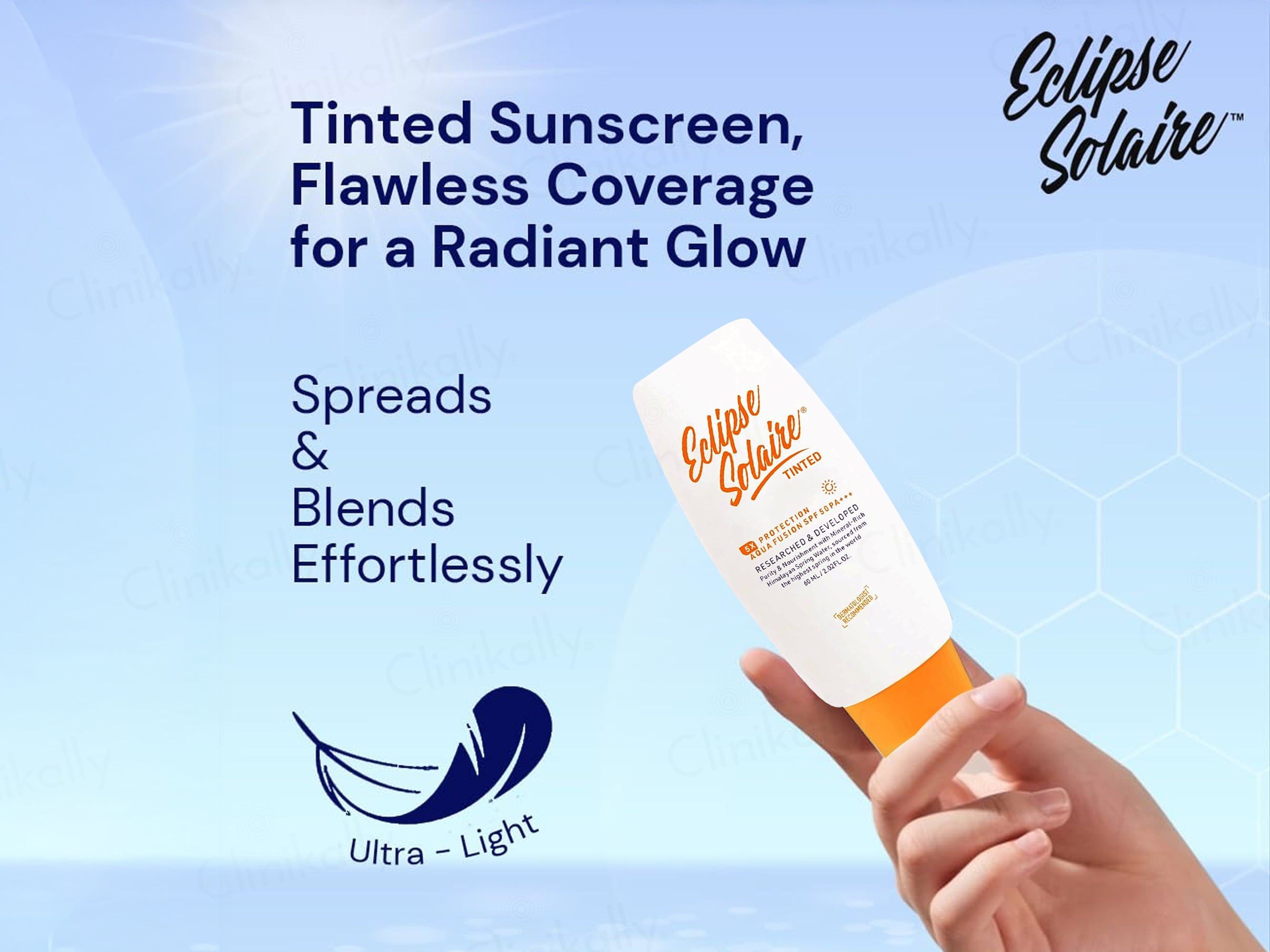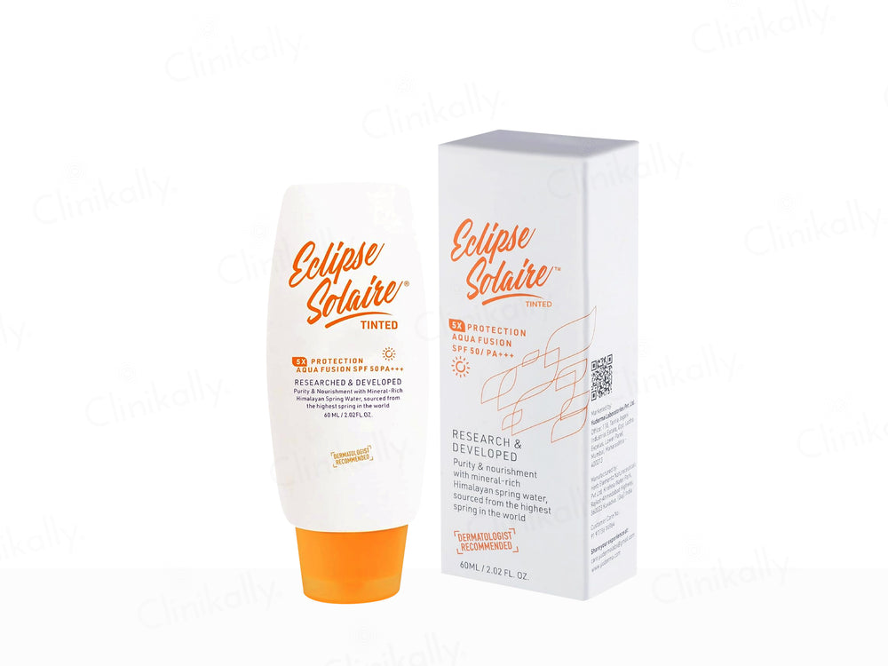 Eclipse Solaire Tinted Aqua Fusion Sunscreen provides broad-spectrum protection with SPF 50, shielding the skin from harmful UVA and UVB rays.