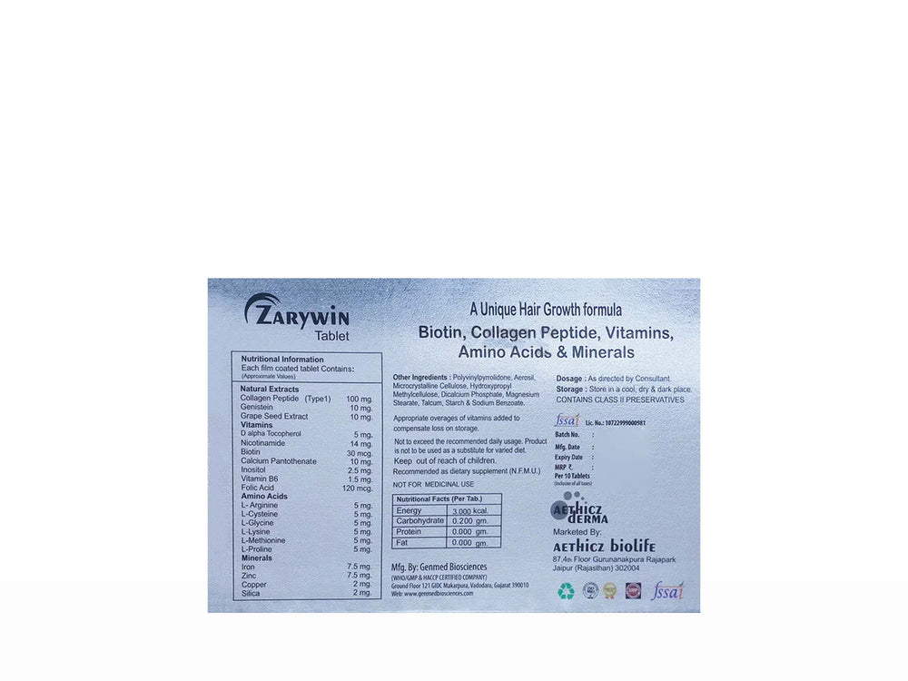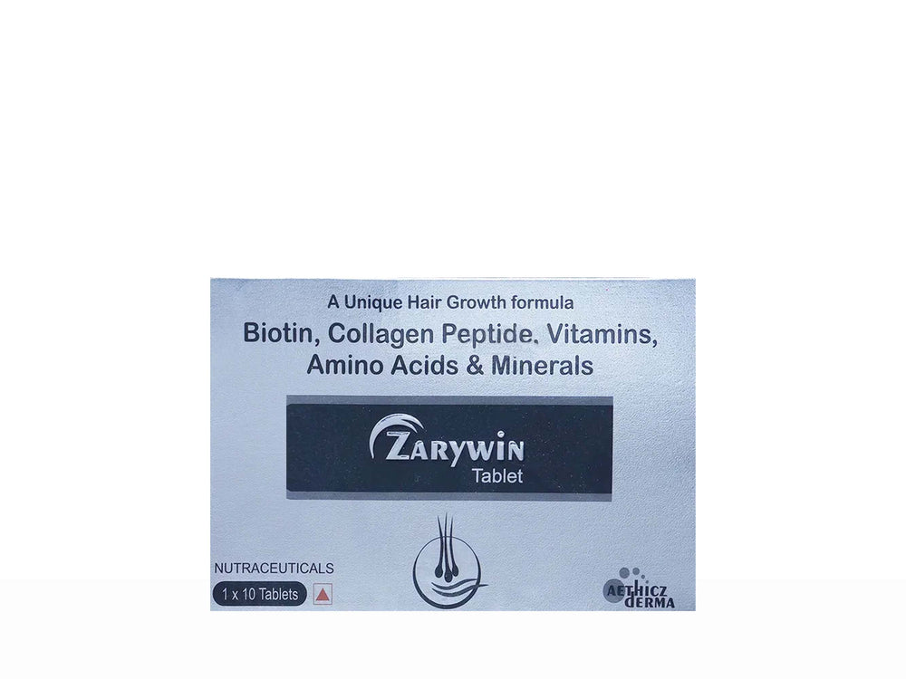 Zarywin Tablet is a unique hair growth nutraceutical designed to support stronger, healthier hair from within. Formulated with biotin, collagen peptide, essential vitamins, amino acids, and minerals, it helps reduce hair fall, improve hair thickness, and promote natural hair regrowth. This advanced hair supplement nourishes hair follicles, supports scalp health, and enhances overall hair strength and shine. Ideal for men and women experiencing nutritional hair loss, Zarywin Tablet works as a daily hair nutrition formula to improve hair quality, vitality, and resilience, making it a trusted choice for complete hair care support.