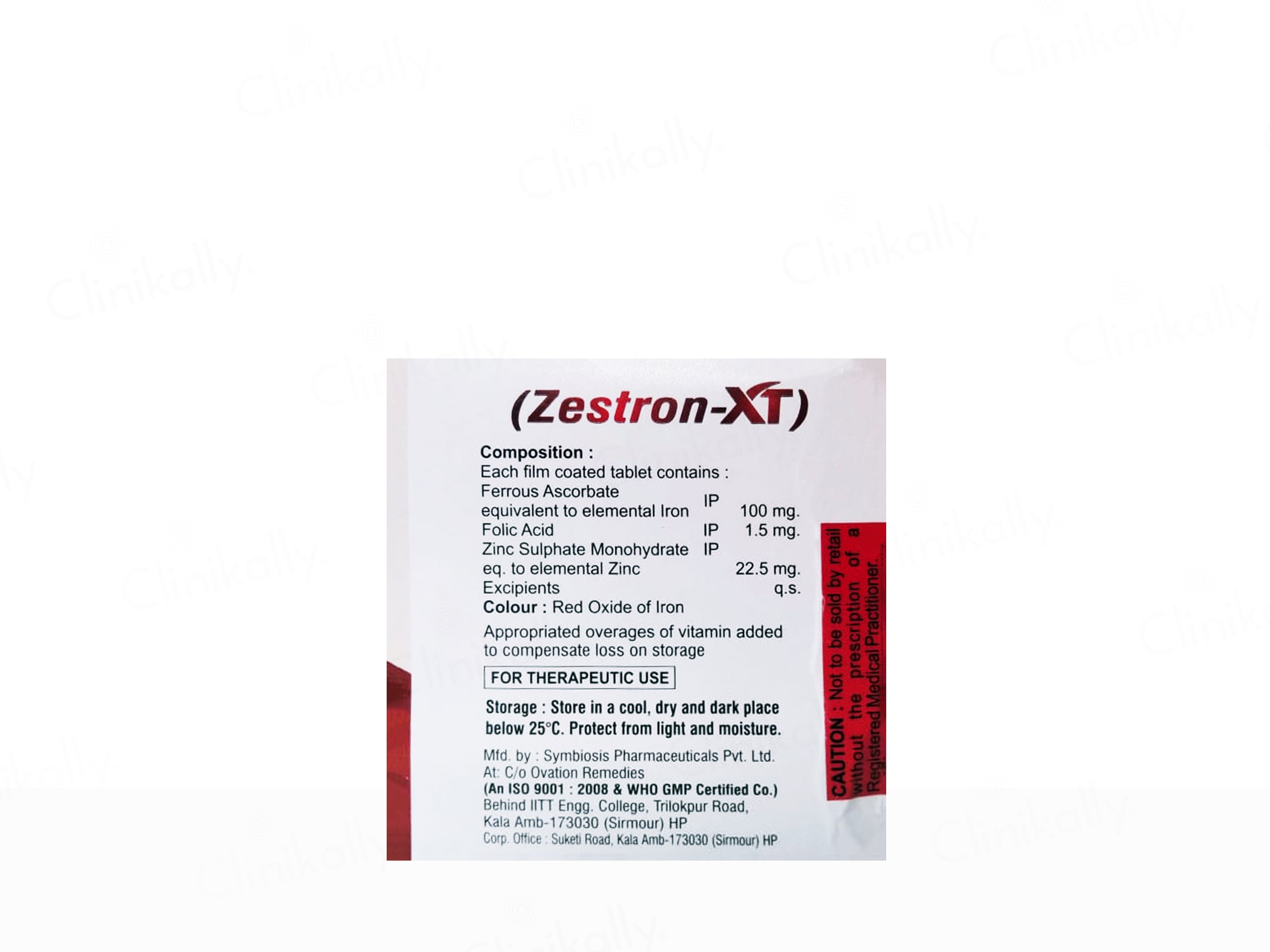 Zestron-XT Tablet is a nutritional supplement containing a combination of Iron, Folic Acid, and Zinc. It is primarily prescribed for the prevention and treatment of iron deficiency anemia, particularly in pregnancy, lactation, and in individuals with poor dietary intake. Ferrous Ascorbate provides elemental iron that improves hemoglobin levels, Folic Acid supports red blood cell production and prevents neural tube defects in pregnancy, while Zinc helps in immune function and overall growth.
